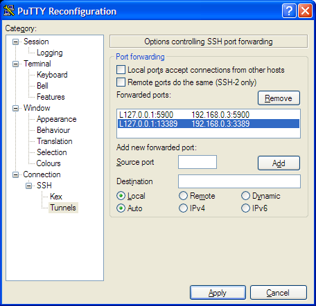 Put “127.0.0.1:13389” in the ‘local port’ box, and then the remote IP and 3389 in the remote port, then click ‘Add’. The window should update to look similar to the one above — in my example the selected line is the one you’re looking for — I’m tunnelling local port 13389 to the remote port 192.168.0.3:3389. (You can also see I’m still tunnelling port 5900 to the remote end; this is VNC’s port number, which I still use from time to time too.)