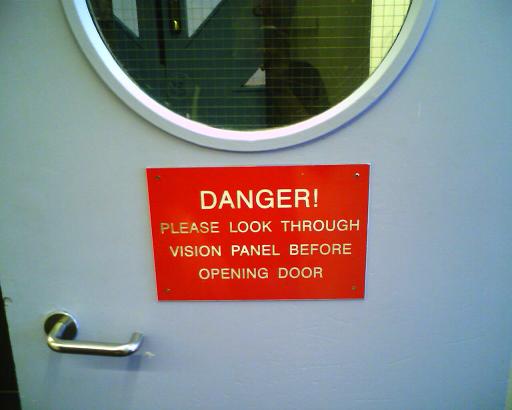 This message is affixed to all the doors in the building I’m currently working in. Why they felt the need to a) state this bloody obvious fact and b) call it a ‘Vision Panel’ instead of a bloody window, I’ve no idea!